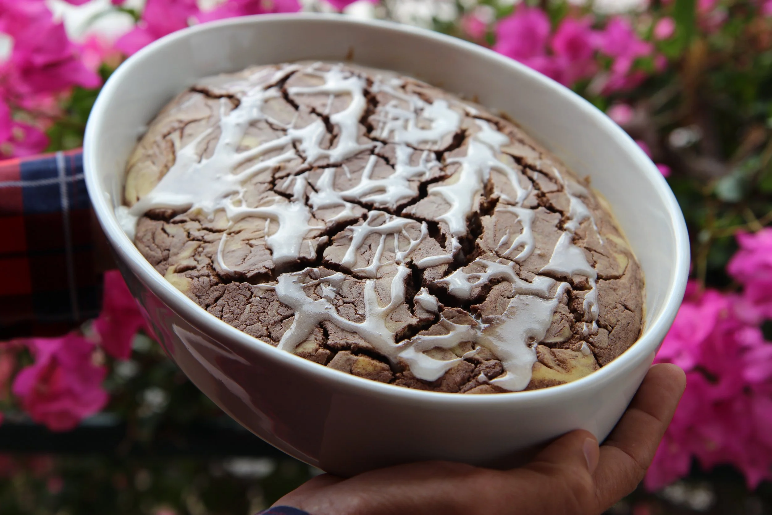 Versate il primo impasto in una tortiera, versate il secondo impasto con un cucchiaio e nel frattempo delicatamente roteatelo (con un cucchiaio o con un coltello). Infine infornate in forno statico e preriscaldato a 180º per 35 minuti circa. Fate sempre la prova dello stecchino negli ultimi minuti di cottura prima di estrarre la teglia dal forno.